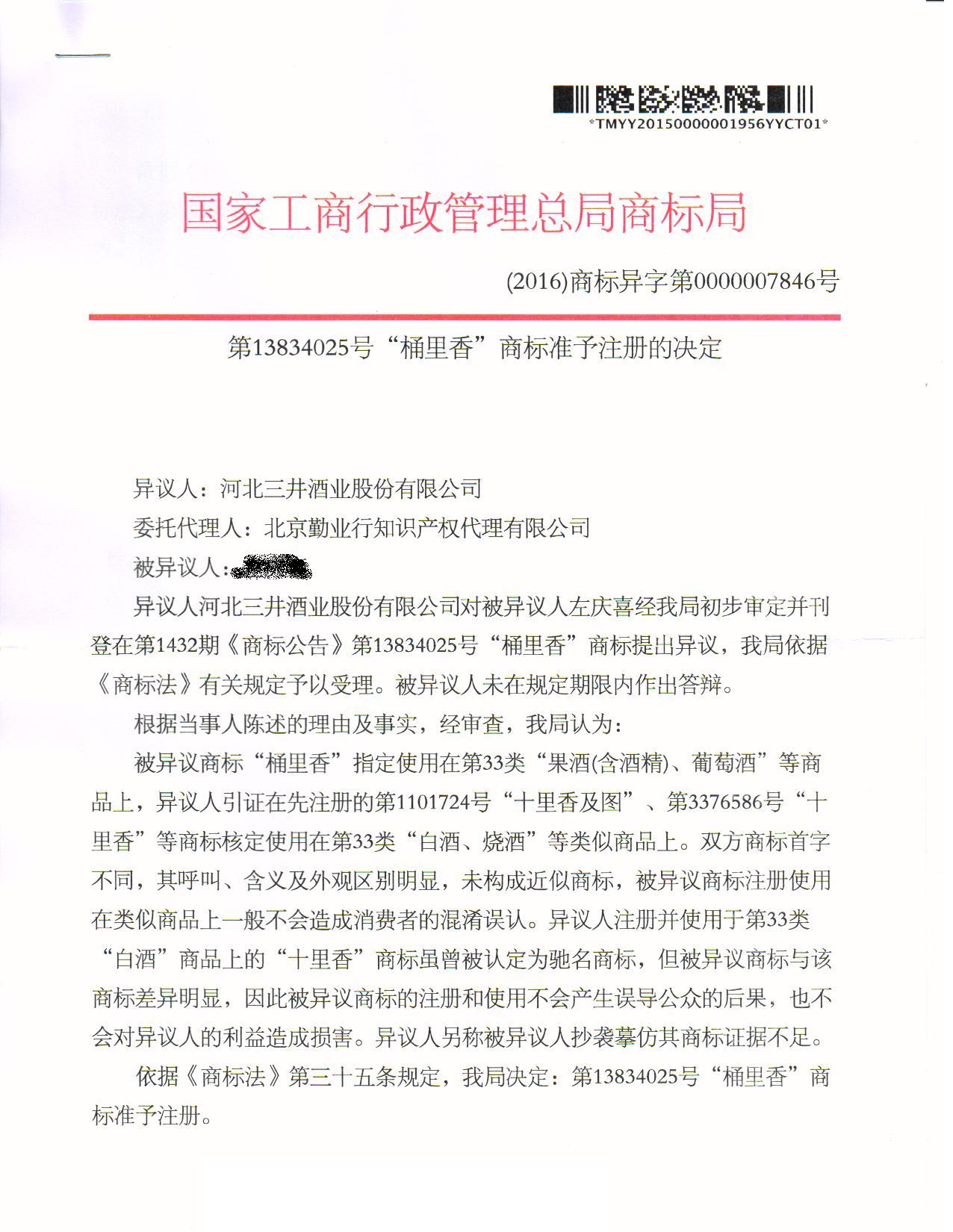 “桶里香”商标准予注册的决定