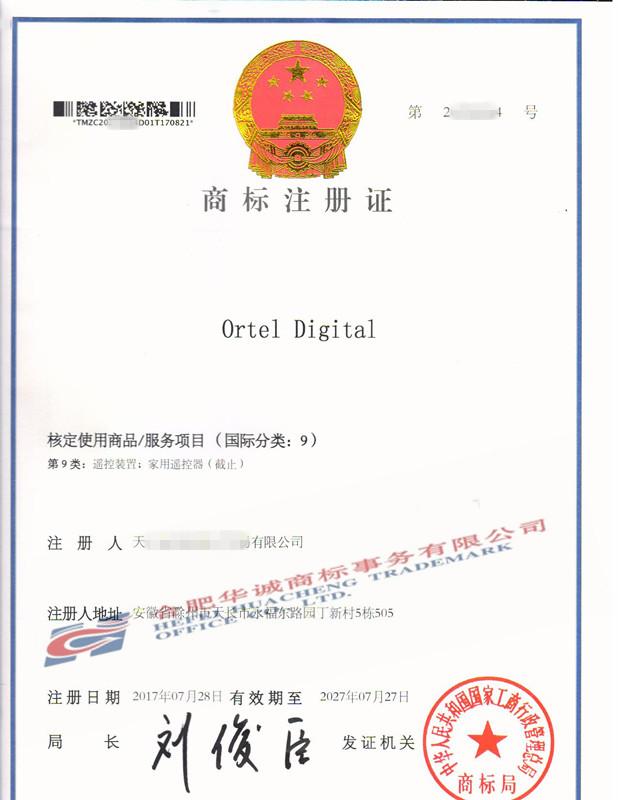 您委托我所代理商标注册申请,名称为“Ortel Digital” 9类商标注册证已下达。