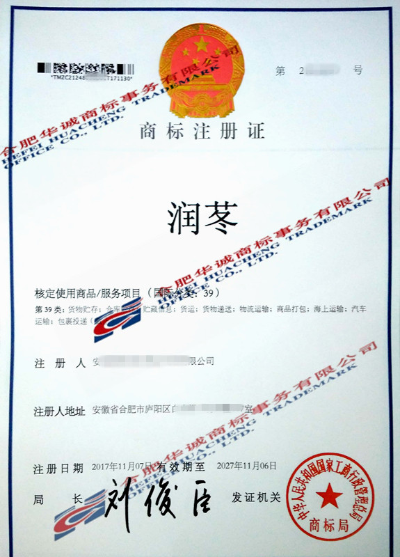 您委托我所代理商标注册申请,名称为“润苳” 39类商标注册证已下达。