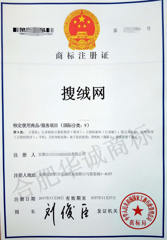 您委托我所代理商标注册申请,名称为“搜绒网” 9类商标注册证已下达。