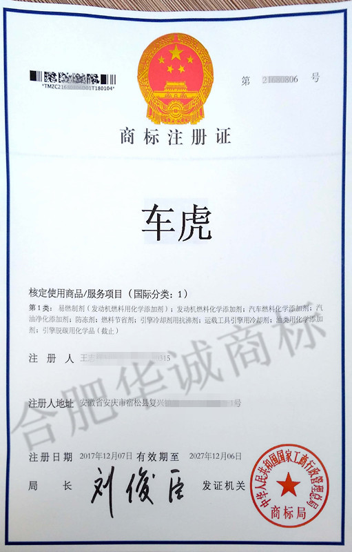 “车虎”1类商标注册证下达