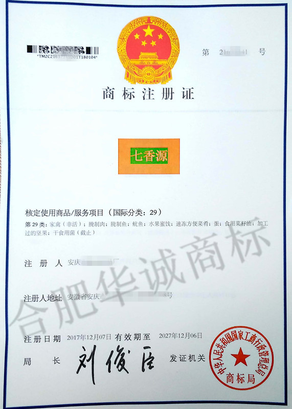 “七香源”29类商标注册证下达