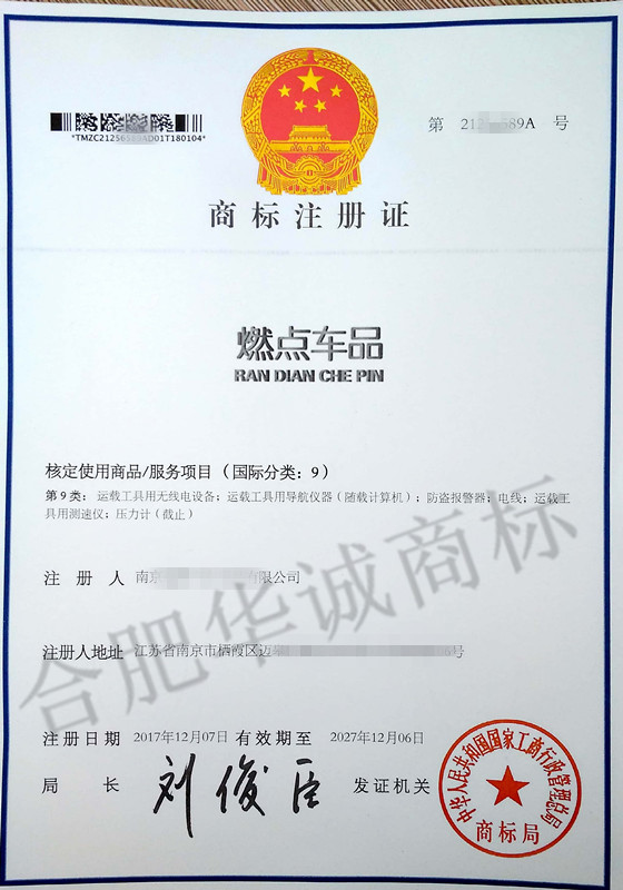 您委托我所代理商标注册申请,名称为“燃点车品” 9类商标注册证已下达。