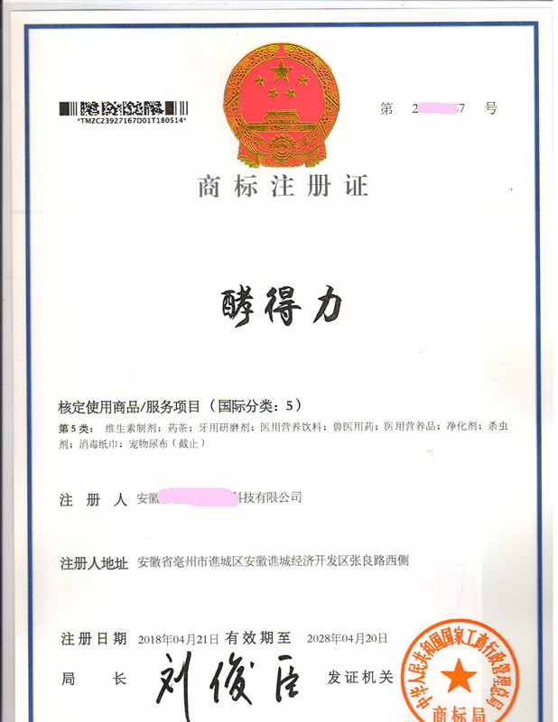 “酵得力”5类商标注册证下达