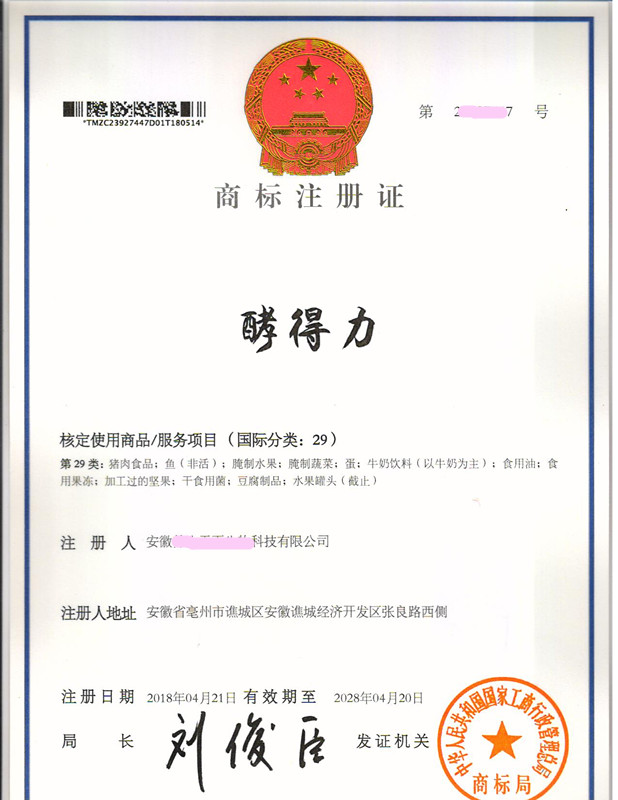 您委托我所代理商标注册申请,名称为“酵得力”29类商标注册证已下达。