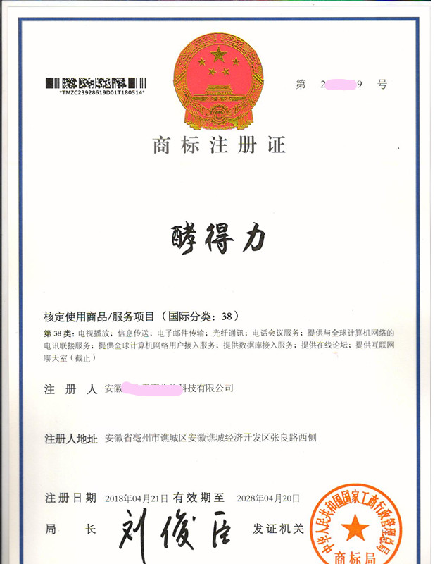 “酵得力”38类商标注册证下达