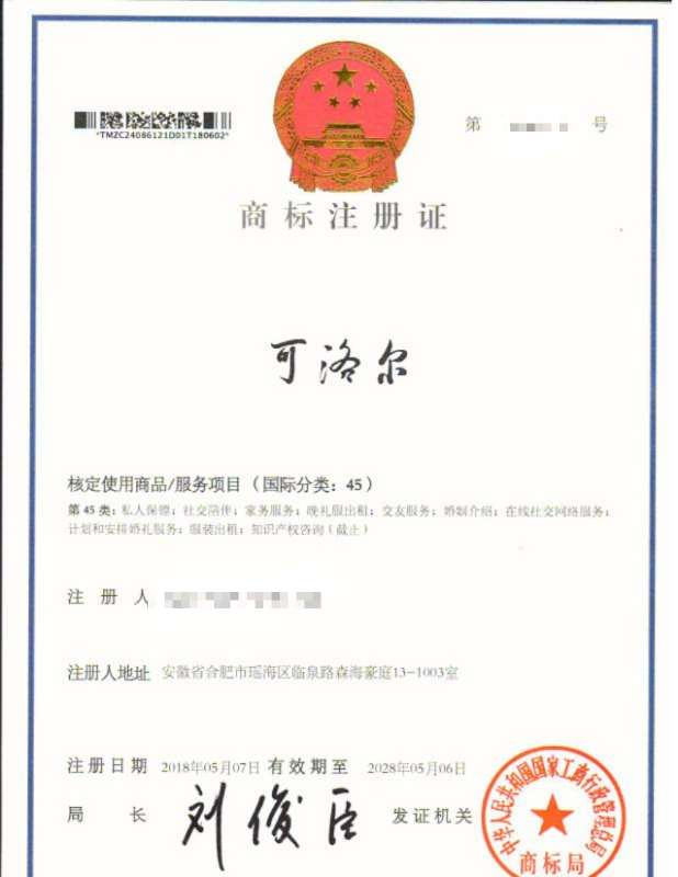 您委托我所代理商标注册申请,名称为“可洛尔”45类商标注册证已下达。