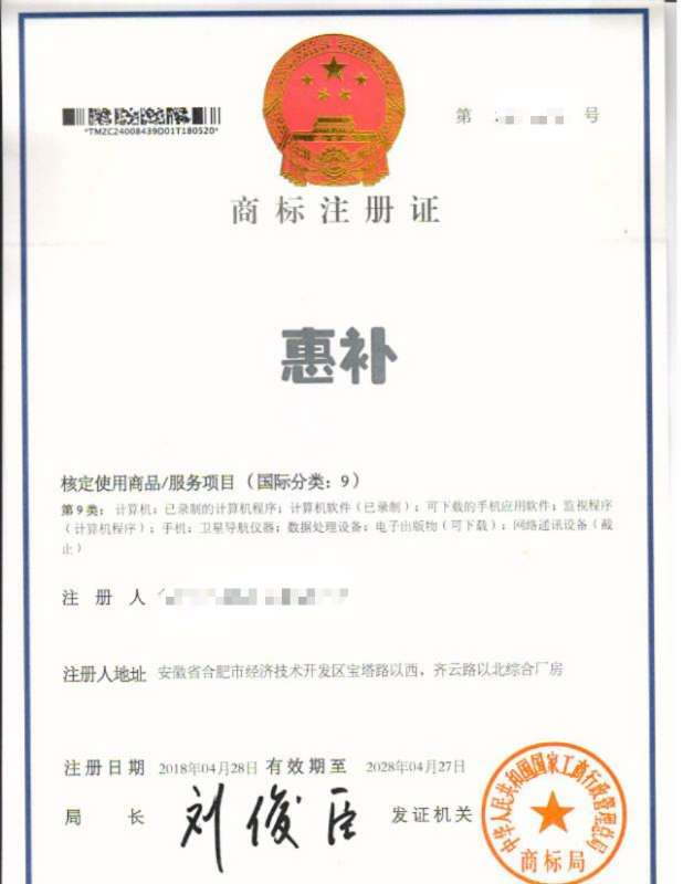 您委托我所代理商标注册申请,名称为“惠补”9类商标注册证已下达。